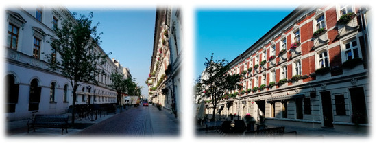 The structure of the historic urban core (the left photography—the south view of 6-Sierpnia Street; the right photography—the north view of 6-Sierpnia Street).