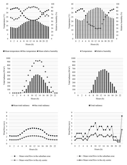 The analysis of microclimatic conditions was carried out on the basis of information obtained from databases of the meteorological station located in the suburban area of the city. It included hourly measurement and actinometrical observation (available for the period 1991 to 2017), as well as meteorological data (available for the period 1960 to 2018). In order to maintain the consistency and comparability of the data, the study was conducted for the period 2004 to 2015. The prevailing microclimatic conditions were estimated for the warm period (May to September) and the hottest day of the year (29 July 2013). The former is taken into account as the microclimate background existing in the city (as the climatological scenario). The latter presents the most uncomfortable conditions. Basic parameters such as total radiation, temperature, relative air humidity, as well as wind speed at an altitude of 10 m above ground level were taken into account. The analysis results are presented in Figure 2.