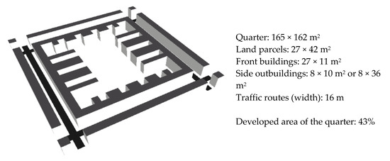 Parameters of the typical metropolitan quarter were estimated on the basis of calculations made for vector files creating the map of the historic urban core. The dimensions of the cadastral parcels were calculated using the GIS software. Generating information about the position of the plot vertexes made it possible to calculate their basic parameters. The average quarter width was 162 m, which meant the presence of six cadastral plots. The average length was determined to be 165 m. Then, the geometry of the frontal buildings on the reference areas was generated. For this purpose, information about the location of the object vertexes was used. Also, the area footprint was determined as 40%. Therefore, the basic assumption was that there are two symmetrical tenement outhouses (except for the frontal buildings). The height of the buildings was calculated on the basis of descriptive information in the attribute table. Parameters of the typical metropolitan quarter are presented in Figure 3.