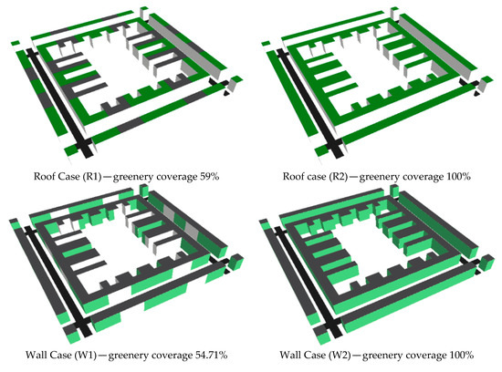 As it was previously mentioned, 100% wall green coverage was taken into account as the comparative scenario. In the case of detailed modeling, complex building structures should be taken into consideration (window openings and doors). Here, the general idea is presented.