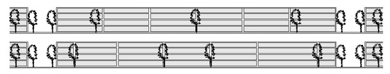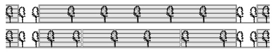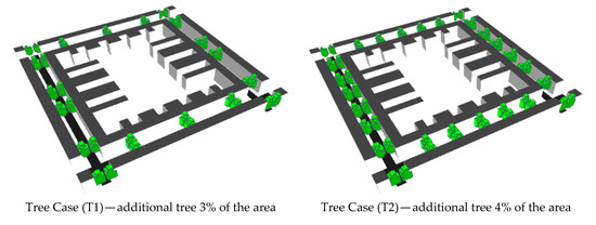 The last case included the introduction of high greenery in street canyons. In the T1 scenario, four lines of trees in canyons with north–south orientation were included (24 deciduous trees, the direct impact of which was 864 m2 of land), as well as four lines of trees in canyons with east–west orientation (12 deciduous trees covering 432 m2) (Figure 5). The location was selected in terms of the real possibility of planting trees in the inner-city area, i.e., at the border with an adjacent plot. In this way, the collision issue of introduced green solutions with areas serving as access roads to buildings was eliminated (usually the gateways are located in the middle of frontal buildings). Additionally, the greenery was introduced at a distance of 2 m from the front elevation ensuring the possibility for pedestrians to move around the buildings (pavements), as well as the proper functioning of the main communication routes in the area of street canyons.