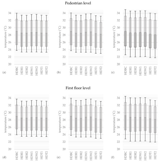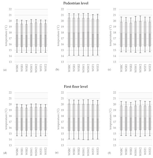 The next case concerned the influence of selected types of green infrastructure on microclimatic conditions during the hottest day of the year (Figure 8). For a base scenario, the analysis results showed that air temperature ranged from 23.78 to 34.00 °C (at 1.4 m), 23.94 to 33.70 °C (at 5 m) within the quarter; 23.71 to 23.06 °C (at 1.4 m), 23.76 to 33.95 °C (at 5 m) in an east–west axis canyon (⊥wind); 22.60 to 34.96 °C (at 1.4 m), 22.81 to 34.45 °C (at 5 m) in a north–south (||wind) orientation canyon. Maximal values (between 1 and 2 p.m.), as well as the highest parameter value dispersion, was observed in the canyon with north–south orientation (|| wind).