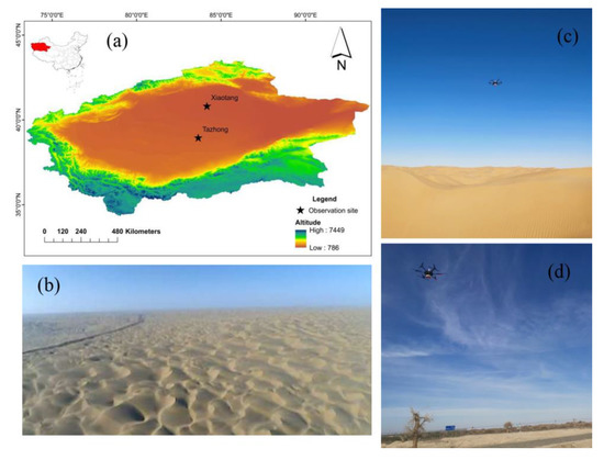 (a) Sites of the UAV observations; (b) a typical image obtained with the UAV. Pictures of the UAV flying over (c) Tazhong and (d) Xiaotang.