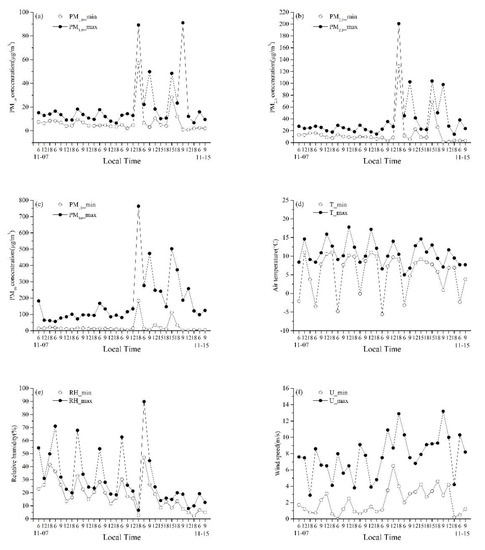 Minimum and maximum particulate matter (PM) concentrations and the various meteorological parameters observed in the Taklimakan Desert (TD) during the study period: (a) PM1.0 concentrations; (b) PM2.5 concentrations; (c) PM10 concentrations; (d) air temperature; (e) relative humidity; and (f) wind speed.
