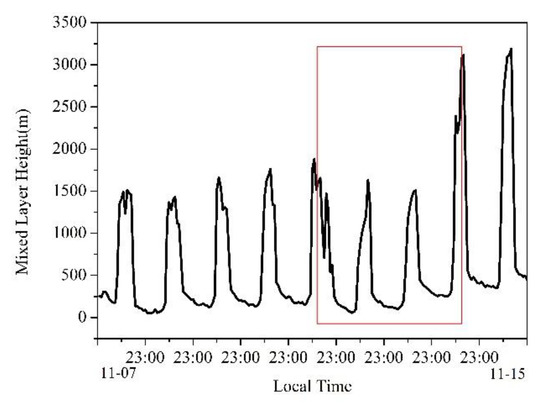 As shown in Figure 3, the mixing layer height, from 7–13 November 2019, had a height range of 1400–1700 m. The mixing layer height was larger from 11:00–17:00 during the day. In dusty weather, the stability, L, increased, the temperature decreased, the mixing layer height was lower, especially in the daytime.