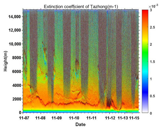 Figure 4 shows the vertical spatiotemporal evolution of the extinction coefficient of the aerosols from 7–15 November 2019 at Tazhong. The aerosols were mainly concentrated below 4 km. In particular, they were concentrated below 1 km from the afternoons of 11–13 November (Figure 4).