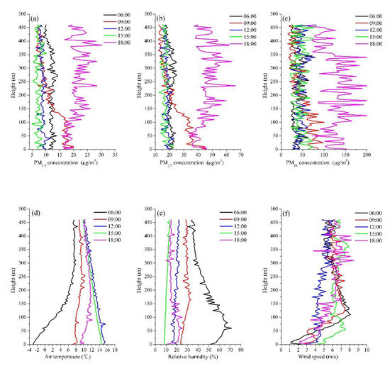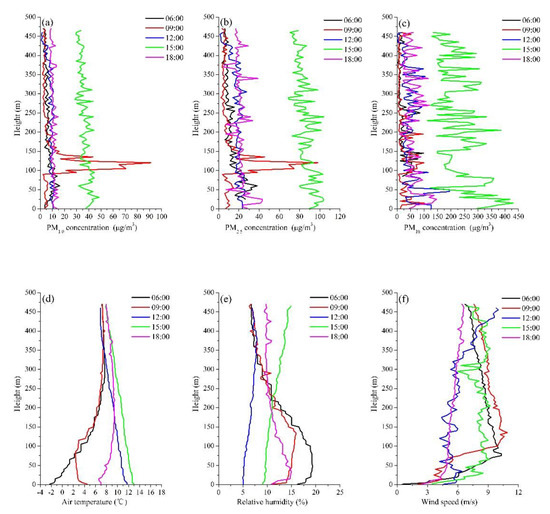 During the daytime, the mixed layer height was the lowest at 06:00 (Figure 2), but the PM concentration was not the highest at this time (Figure 6a–c), because PM diffusion was found to be related to the high wind speed at 06:00, in which the wind speeds ranged from 1 to 8 m∙s−1 (Figure 6f). At 09:00, the mixed layer height increased (Figure 2), and the PM concentrations above 230 m were lower than that at 06:00. PM concentrations seems to depend on the height and size. Interestingly, the PM concentrations below 150 m heights at 09:00 were higher than those at the same height at 06:00 (Figure 6a–c). Within 0–150 m, the PM concentrations decreased in height at 09:00; in particular, PM1.0 and PM2.5 decreased from 20 µg∙m−3 to 12 µg∙m−3, respectively, and from 46 µg∙m−3 to 24 µg∙m−3, respectively. The humidity and wind speed increased below 150 m heights at 09:00 (Figure 6a–c,e,f). At larger boundary layer heights (Figure 2), the PM concentrations were lower at 12:00 and 15:00 (Figure 6a–c). At 12:00 and 15:00, the air temperature decreased with height (Figure 6d). The wind speed was the largest below a height of 100 m at 15:00, which increased with the height from 4 m∙s−1 to 7.5 m∙s−1 (Figure 6f). The PM concentration was the highest at 18:00, with PM1.0, PM2.5, and PM10 concentrations between 15 and 30 µg∙m−3, 33–66 µg∙m−3, and 24–205 µg∙m−3, respectively (Figure 6a–c). At 18:00, there was also a temperature inversion, in which the air temperature fluctuated from 9–11 °C, although the inversion intensity was not as strong as at 06:00 (Figure 6d). It was found that the lower mixed layer was favorable for the accumulation of dust aerosols, where the wind speeds therein at 18:00 were low and the PM concentrations at 18:00 were the highest.