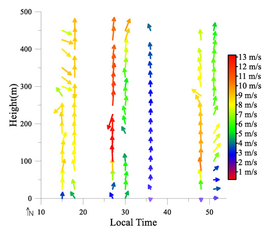 During the observation periods, the PM1.0, PM2.5, and PM10 concentrations were between 3.7 and 48.5 µg∙m−3, 5.7 and 104 µg∙m−3, and 2.3 and 430.4 µg∙m−3, respectively, at Xiaotang. The daily variations of PM1.0, PM2.5, and PM10 at Xiaotang were different from those at Tazhong because sand and dust weather appeared at Xiaotang but did not appeare at Tazhong during the observation periods. The maximum values of PM1.0, PM2.5, and PM10 appeared at 15:00 at Xiaotang, and the differences between their values at other times were very small. At a height of 90–150 m at 09:00, the PM1.0 and PM2.5 concentrations suddenly increased by 23 times and 15 times, respectively (Figure 7a–c). At 09:00, a temperature inversion occurred at a height of 90 m, and the inversion strength was 1.42 °C∙100 m−1 (Figure 7d). At 09:00, the relative humidity decreased significantly with an increase of height above 130 m, decreasing by about 60% above a height of 100 m, while the relative humidity increased with an increase of height below 130 m (Figure 7e). Below a height of 150 m, the wind speed was the highest, increasing from 2.1 m∙s−1 near the ground to 10.5 m∙s−1 at 9:00. Additionally, the wind speed increased from 0.5 m∙s−1 to 10.3 m∙s−1 and increased from 3.4 m∙s−1 to 9.1 m∙s−1 at 6:00 and 15:00, respectively. The wind speed changed little with height during the other times (Figure 7f). We noticed that, at 9:00, the wind direction shifted over 150 m, from north to west, then from west to east, and then west (Figure 8). At 09:00, the high wind speed above 150 m decreased the concentrations of PM1.0 and PM2.5, but the wind speed near the surface was very small. Due to the presence of the temperature inversion above 90 m, the atmospheric was stable, while below 90 m, the atmospheric was neutral, so that the PM1 and PM2.5 concentrations were not at a maximum near the ground, but instead peaked at 90–150 m.