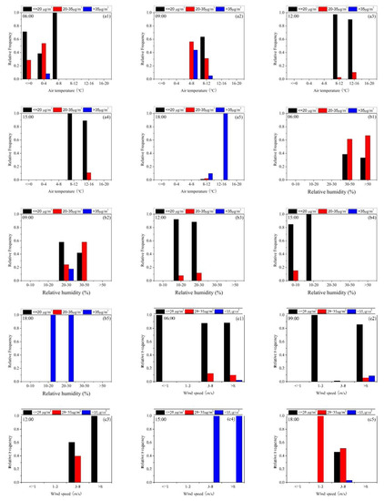 Histograms of the air temperature (a1: 06:00, a2: 09:00, a3: 12:00, a4: 15:00, and a5: 18:00), relative humidity (b1: 06:00, b2: 09:00, b3: 12:00, b4: 15:00, and b5: 18:00), and wind speed (c1: 06:00, c2: 09:00, c3: 12:00, c4: 15:00, and c5: 18:00) for different PM concentrations (black columns are ≤20 µg∙m−3, red columns are 20–35 µg∙m−3, blue columns are >35 µg∙m−3) during the observation periods at Xiaotang.