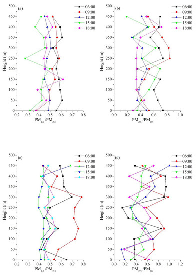 Figure 11 shows that within 500 m of the boundary layer at Tazhong, the PM1.0/PM2.5 ratios were between 0.25 and 0.65 (Figure 11a) and the PM2.5/PM10 ratios were between 0.10 and 0.85 (Figure 11b). Meanwhile, the PM1.0/PM2.5 ratios at Xiaotang were between 0.40 and 0.80 (Figure 11c) and the PM2.5/PM10 ratios were between 0.10 and 1.0 (Figure 11c). In other words, there were more fine particles in the boundary layer at Xiaotang. Due to the distribution of vegetation around Xiaotang, the vegetation reduces the wind speed, so larger particles of dust cannot be blown into the air. Among them, the values of PM1.0/PM2.5 and PM2.5/PM10 were mainly larger at 06:00 and 09:00 at Tazhong and Xiaotang.