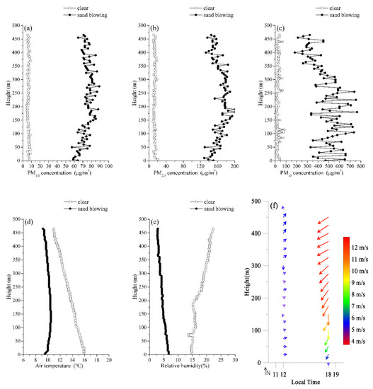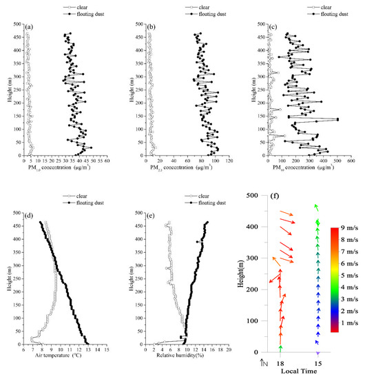Vertical profiles of the PM concentrations (a: PM1.0, b: PM2.5, and c: PM10) and the related meteorological parameters (d: air temperature, e: relative humidity, and f: vector wind) in the boundary layer during a clear period (18:00 local time, 14 November) and a floating dust period (15:00 local time, 13 November) at Xiaotang.