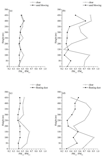 Ratios of PM1.0/PM2.5 and PM2.5/PM10 during the clear period (12:00 local time, 8 November) and a sand blowing period (18:00 local time, 11 November) at Tazhong (a,b) and during a clear period (18:00 local time, 14 November) and a floating dust period (15:00 local time, 13 November) at Xiaotang (c,d).