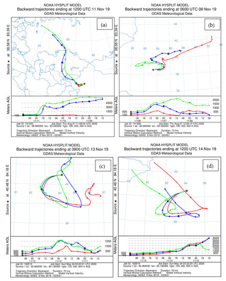Backward trajectory of the air mass calculated at (a) 12:00 UTC (Coordinated Universal Time) on 11 November (floating dust period), 2019, at Tazhong; (b) 06:00 UTC on 8 November (clear period), 2019, at Tazhong; (c) 09:00 UTC on 13 November (sand blowing period), 2019, at Xiaotang; (d) 12:00 UTC on 14 November (clear period), 2019, at Xiaotang.