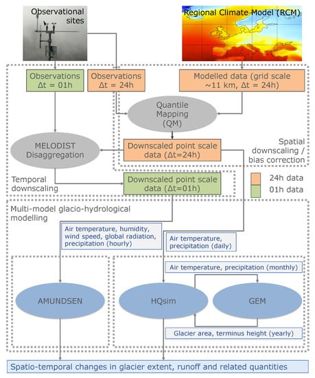 For the first time, we compare the outcome of two glacio-hydrological models, being a representative example for a wide range of existing models in terms of complexity (low vs. high). The novelty of this comparison is that we combine each hydrological model with different glacier models, as opposed to other studies that only concentrate on hydrological models. Besides separate glacier models, we also use different glacier initialization times for both model approaches (i) HQsim-GEM and (ii) AMUNDSEN. Both are forced with the same downscaled and bias-corrected climate projections for the RCPs (Representative Concentration Pathways) 2.6, 4.5, and 8.5. The first glacio-hydrological model HQsim-GEM is a coupled version of two independent models on different timescales: a low-complexity glacier evolution model (GEM) by Marzeion et al. [30] based on a temperature-index approach on a monthly resolution; and a semi-distributed hydrological model (HQsim), originally developed for operational flood forecasting, allowing a daily resolution within this context. It only requires the meteorological variables air temperature and precipitation, two components assumed to be the main drivers of glacier mass balances to simplify matters. The ability of reproducing glacier advances is the key advantage of this model setup compared to other glacio-hydrological models. Our second model, AMUNDSEN [31,32], implemented the method [10] to adjust glacier geometry in a more complex, physical-based approach, with a high temporal and spatial resolution. To estimate uncertainties from the input data, we use multi-model ensemble means based on different emission scenarios.