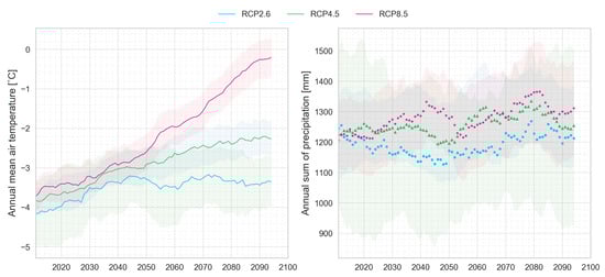 Both glacio-hydrological models were forced with the spatially and temporally (AMUNDSEN) downscaled (point-scale station Vent in HQsim) and bias-corrected EURO-CORDEX emission scenarios RCP 2.6, RCP 4.5, and RCP 8.5. In Figure 3, the evolution for both (i) the annual mean of air temperature and (ii) the yearly sum of precipitation is depicted, showing a future evolution of the multi-model ensemble mean including a 11-year centered moving average for each scenario and uncertainties covering the total bandwidth of all ensemble members within the 95% confidence interval. Air temperature rise is most pronounced for the worst-case scenario RCP 8.5, whereas RCP 4.5 will very likely suggest an increase in temperature, and RCP 2.6 (which is the closest to the 2015 Paris agreement) is projected to stabilize during the second half of the 21st century. Multi-model projections of annual precipitation sums under the RCP 2.6 scenario have a vast bandwidth, showing a marked divergence between the three ensemble members, making general statements difficult. RCP 4.5 and RCP 8.5 tend to evolve similarly, except for the period between 2040 and 2050. RCP 8.5 is assumed to have a greater amount of precipitation sums, especially for winter precipitation, see Hanzer et al. [7] for a more detailed information on projected seasonal changes for both variables.