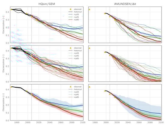 Results for the catchment glacierization from the two glacio-hydrological models HQsim-GEM (left sub-figures) and AMUNDSEN (right sub-figures). The top row shows only the three GCM-RCM combinations which are available for all three RCPs, the middle row all GCM-RCM combinations (i.e., three for RCP 2.6 and 14 each for RCP 4.5 and 8.5), and the bottom row the same but with the uncertainty (95% confidence interval) shown as shaded bands instead of the individual model realizations.