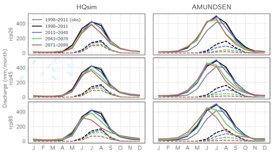 Simulated runoff for HQsim-GEM (left) and AMUNDSEN (right) under the different emission scenarios RCP 2.6 (top), RCP 4.5 (middle) and RCP 8.5 (bottom). Lines represent monthly multi-model ensemble means for total runoff (solid lines) and ice melt (dashed lines) for three different future climate periods (colored lines). Grey and black lines correspond to observed runoff during the period 1998–2011 (grey) and the corresponding simulation results (black).