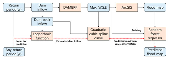 Accordingly, this study presented a technique to generate predicted flood maps rapidly when dam peak inflow (or dam inflow return period) is given along with the random forest regression technique. Flood maps for extreme condition were analyzed, and in this study, it means extensive inundation in metropolitan watersheds with the excessive discharge or collapse of dam. Since PMF (probable maximum flood) conditions were also considered, the extreme flood patterns due to climate change were analyzed with machine learning and numerical program. For random forest regression, the maximum water surface elevation for cross-sections was entered. For the rapid estimation of maximum water surface elevation for each cross-section, the log function and the spline curves were applied. The independent variable of the log function was the dam inflow return period and the dependent variable was the amount of dam inflow in cubic meter per seconds. The spline curves were generated with using maximum water surface elevation information calculated by the DAMBRK model. When any dam inflow return period was entered, the log function was used to estimate the peak inflow of the dam, and the maximum water surface elevation for each cross-section was estimated in a short time with a spline curve. Based on the maximum water surface elevation calculated by the DAMBRK model and the flood map data generated by the GIS program, the basic data for random forest regression was established. The proposed methodology aids production of large-scale flood map data, and flood risk was calculated to indicate the utilization of flood map data using the population of Seoul City and information regarding hospital and fire station accessibility. This study will enable sufficient flood data to be established in advance, as various extreme climate change-associated flood events may occur in future. The flowchart for this study is shown in Figure 1 and Figure 2. The random forest data for the study section shown in Figure 1 was used for flood map prediction, and the random forest data in Figure 2 was applied to select weights for each flood risk factor.