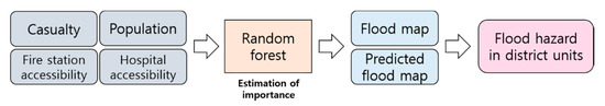 The sum of each flood risk factor was calculated for districts of Seoul as shown in Figure 12d. In order to select weights for the three risk factors, the human casualty record during 2010~2017 and the random forest importance estimation technique were applied. Over eight years, 26 people were injured or killed due to flooding. The feature importance was calculated by entering the data of casualties, the number of people in the area where the damage occurred, and hospital and fire station accessibility data into the random forest model. In other words, the weight was calculated using the relationship between the factors that could affect human casualties and the damage history. The random forest weight (feature importance) selection results were calculated as 0.41 for population, 0.36 for access to hospitals, and 0.23 for access to fire stations.