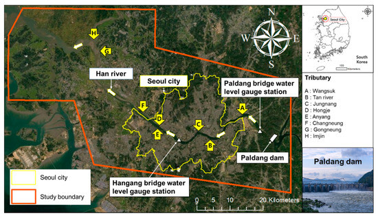 For the purpose of flood map analysis, the Paldang dam and the Han river basin were selected as the study area. The study area for this research, including the Seoul Metropolitan, is shown in Figure 3, and the area of the study boundary is 3140 . The city of Seoul, which has an area of 605 , is comprised of 25 administrative districts. This area has been damaged by sudden discharge from the Paldang dam during flood season and rising water surface elevation in the mainstream of the Han River.