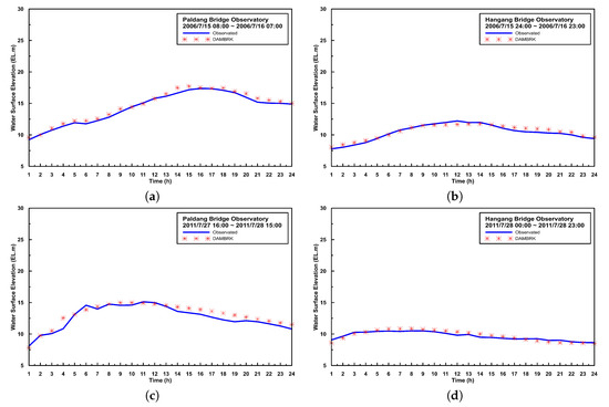 Validation of DAMBRK with observed W.S.E. (a) W.S.E. in Paldang Bridge (2006); (b) W.S.E. in Hangang Bridge (2006); (c) W.S.E. in Paldang Bridge (2011); (d) W.S.E. in Hangang Bridge (2011).