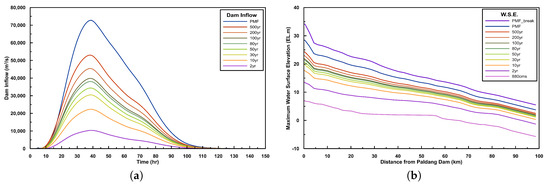 In this study, one-dimensional rainfall-runoff analysis of HEC-1 was performed for the inflow of Paldang dam, and inflows of 2, 10, 30, 50, 80, 100, 200, and 500-year return periods were considered. In order to determine the additional maximum possible extent of flooding, the inflow was used in consideration of the probable maximum flood (PMF). The peak inflows of the 2 to 500-year return periods and PMF conditions were 10,372, 22,361, 30,479, 34,380, 380,633, 39,837, 45,455, 53,043 and 72,771 , respectively. The dam inflow is shown in Figure 5a, and the lateral inflow of the tributary rivers in the DAMBRK simulation applied the 100-year return period inflow. The peak inflows from the eight tributaries are shown in Table 1. For the discharge conditions through the dam spillway, the maximum discharge conditions were considered, including the reservoir water level-discharge relationship (Table 2). The maximum water surface elevation by distance as calculated by DAMBRK is as shown in Figure 5b.