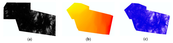 Digital elevation models for flood mapping. (a) Elevation DEM; (b) max W.S.E. DEM; (c) flood depth DEM.