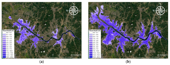 Flood map calculation using DAMBRK and the GIS program. (a) 500 y; (b) PMF (dam-break).