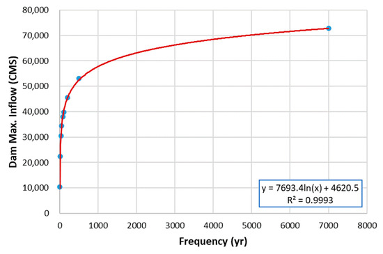 Logarithmic fitting with frequency and peak dam inflow data.