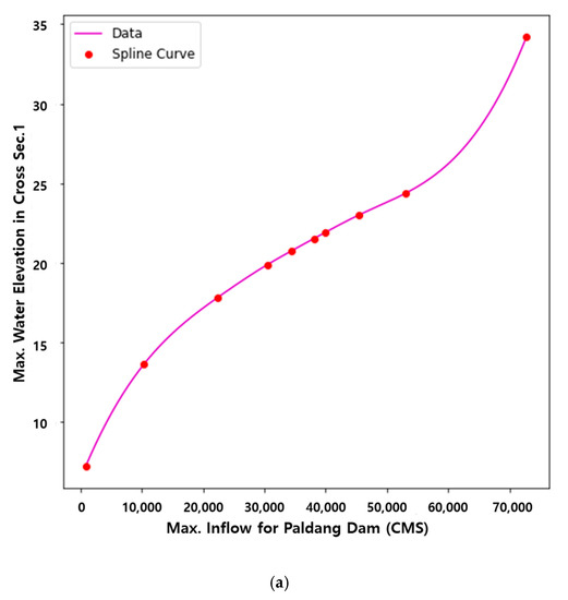 (3) Rapid estimation of maximum water surface elevation for 44 cross-sections was performed using cubic and quadratic spline curves. This process serves as an important medium for connecting input and prediction results in order to predict flood maps according to the amount of dam inflow. There are, however, some limitations to these estimated results of mapped maximum flooding in proportion to peak dam inflow due to the suggested methodology considering only the maximum discharge according to the reservoir level. Nevertheless, it is deemed appropriate for expressing the extent of extreme flooding instances.