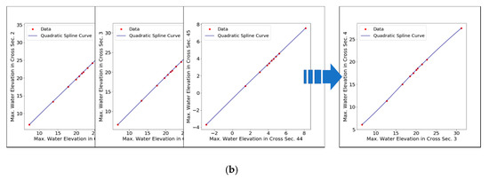 The relationship between the dam inflow return period, the peak dam inflow, and the maximum water surface elevation of the cross-section was defined through the log function and the second and third spline curves. These curves were used to quickly estimate the input data for a random forest given the dam inflow conditions. All of flood condition that containing the flood of 2, 10, 30, 50, 80, 100, 200, and 500-year return periods and PMF was applied to create a more realistic relationship curve. The peak inflow of the dam according to the 2 to 500-year return periods and PMF conditions was defined by the log function and can be expressed as shown in Figure 8. The relationship between dam peak inflow and the maximum water surface elevation of the first cross-section was defined as the third spline curve (Figure 9a), and the maximum water surface elevation between the first and the rest of the cross-sections was defined in the second spline curves (Figure 9b). The maximum water surface elevation for 44 cross-sections was calculated using the logarithmic function and the spline curve in a short time. This process served as an important medium between the hydrologic data in order to predict the flood map according to the peak inflow of the dam. The 44 maximum water surface elevations were summed to be changed as total maximum water surface elevation, and this data entered as input data of random forest model.
