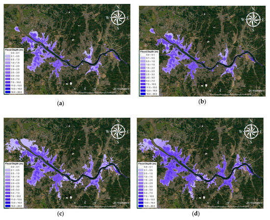 Flood Mmaps predicted by random forest regression. (a) 400 y; (b) 600 y; (c) 1000 y; (d) 2000 y.