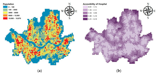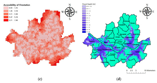 In this study, a simple and intuitive method was suggested to calculate the relative flood risk in district units in consideration of human casualties. Grid unit (square type 500 ) population, hospital accessibility, and fire station accessibility data was used, as shown in Figure 12a–c. The unit of accessibility data for fire stations and hospitals was , the accessibility is the distance to the fire stations and hospitals that closest to the center point of the grid. When a flooding depth of more than 25 , which is a normal road curb height, occurred in a two-dimensional grid, it was considered to constitute flooding [17]. Population and hospital/fire station accessibility in the grid in which flooding occurred were considered in the flood risk calculation. Both flood maps calculated using DAMBRK-ArcGIS and predicted via random forest were applied. Flood analysis considering emergency rescue facilities, including hospitals and fire stations, was performed by Coles et al. [18] and Bruijn et al. [19]. In particular, Coles et al. [18] used flood guidance results for numerical analysis and determined that decrease in accessibility to hospitals and emergency rescue facilities due to flooding would increase the flood-prone population value.