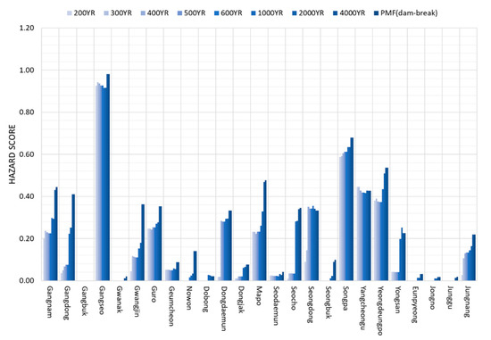Flood risk in district units was calculated for the 200, 300, 400, 500, 600, 1000, 2000 and 4000-year return period and PMF (dam-break). Because the design of levee in Seoul city was conducted based on flood of 200-year return period, flood risk analysis was performed based on the flood of 200~4000-year return periods and PMF (dam-break) condition. The total number of people in the grid that shows flooding, and the total access distance for hospitals and fire stations were calculated by district, and each factor was normalized. By multiplying the weight calculated via random forest, the relative flood risk was calculated by adding them all together, and the results are shown as Table 3 and Figure 13. In the Gangseo district, a high flood risk was calculated. The risk of flooding was not calculated in the Gangbuk district because no flooding of any depth was observed due to Gangbuk district being higher than other area and far from the Han River. The proposed technique is believed to be useful for comparing the relative flood risk for adjacent areas, such as the Gangnam and Seocho districts, and can calculate relative flood risk rapidly and generate various flood maps.