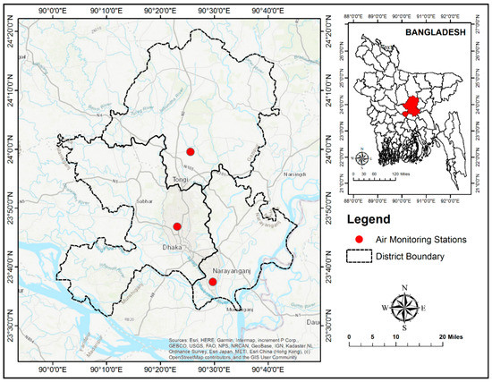 The study conducted in Dhaka, Gazipur and Narayanganj City Corporation in Bangladesh. Every metropolitan area has specific importance for considering as study area in this research. Dhaka is the capital of Bangladesh which is situated in the central part (23°41′ N latitude and 90°22′ E longitude) of the country with an area of 306.38 km2. In terms of population density and fast-growing urban sprawling, it is ranked 19th among 47 megacities in the world [17]. Moreover, the city is exposed to air pollution problems at a higher rate among the cities worldwide [36]. On the other hand, Narayanganj is the most polluted city in Bangladesh at the moment, as it is one of the industrial zones in the country [17]. The city, with an area of 687.7 km2, is located in between 23°33′ and 23°57′ north latitudes and in between 90°26′ and 90°45′ east longitudes. Gazipur is also an industrial zone in Bangladesh, with an area of 1741.5 km2. The city is located in between 23°53′ and 24°21′ north latitudes and in between 90°09′ and 92°39′ east longitudes (Figure 1). The study areas experience a hot, wet and humid tropical climate.