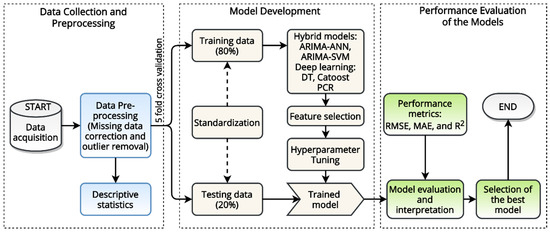 The overall methodology of this study is divided into four parts: (a) data pre-processing, that involves the collection of pollutants and meteorological data and the correction of missing values; (b) investigation of the relations among meteorological parameters and pollutants; (c) feature importance, that involves the screening of features among meteorological variables and air pollutants before operating the models; (d) application of the models namely ARIMA-ANN, ARIMA-SVM, PCR, DT and CatBoost. Figure 2 represents the overall methodological framework of the study.