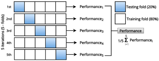 After the pre-processing, the dataset consists of 2342 observations which covered the daily 24-h mean concentration of particulate matter. Before the implementation of the following models, data splitting was executed. This was performed by splitting data into two subsets, that is, training data (80%) and testing (20%) data. The training data was used to develop the model and the test data was used for model evaluation. K-fold (K = 5) cross validation (CV) method was implemented to evaluate the models in consistence with our previous study [35]. The CV method is illustrated in Figure 3.