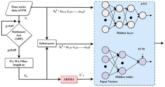 Architecture of proposed (moving average-filter) hybrid models that is, Auto Regressive Integrated Moving Average-Artificial Neural Network (ARIMA-ANN) and ARIMA-Support Vector Machine (ARIMA-SVM). The time series data is considered as a combination of linear () and nonlinear components (). After the stationary test, two components are separated from the original data by using moving average (MA) filter with the length of M. Then, the linear and nonlinear component was modelled by ARIMA, and ANN and SVM, respectively.