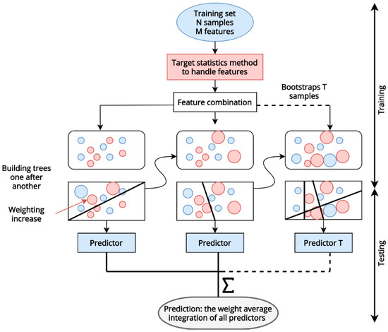 where p is a prior value, a is the weight of prior value. This method contributes to reducing the noise obtained from the low-frequency category. CatBoost combines multiple categorical features. Generally, it utilizes a greedy way to integrate all categorical features and their combinations in the current tree with all categorical features in the dataset (Figure 5). Moreover, it can overcome gradient bias found in traditional GBDT by utilizing a method to change the gradient estimation in the classic algorithm, which is named as ordered boosting. This method can overcome the limitation, that is, prediction shift caused by gradient bias and enhance the generalization ability of the model.