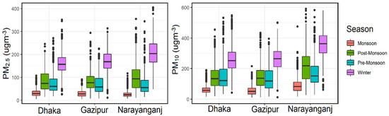 The overall statistics of the seasonal and daily pattern of particulate matter across the air monitoring stations are illustrated in Figure 6 and, Supplementary Materials Figure S1. It is clear from the figures that the concentration of PM10 and PM2.5 across the stations was the highest in winter whereas it was lowest in the monsoon season. The fluctuation pattern with the seasonal variation throughout the stations was almost the same. In winter, the highest mean concentration of PM2.5 and PM10 was observed in Narayanganj (201.3 µg m−3 and 347.1 µg m−3, respectively) and the lowest in Dhaka (153.0 µg m−3 and 270.5 µg m−3). However, in monsoon, it was found the highest PM2.5 concentrations in Narayanganj (31.4 µg m−3) and lowest in Gazipur (26.4 µg m−3). From the above statistics, it is clear that there is a relation among the particulate matters and meteorological variables throughout the seasons. Many studies identified the relationship among PM2.5, PM10 and meteorological parameters across different countries in the world that is, Bangladesh [23]; Malaysia [43], China [44], India [45] and Australia [46]. The study [23,35] illustrated the relationship among the air pollutants and meteorological parameters (mean temperature, relative humidity, rainfall, solar radiation, barometric pressure, wind speed and wind direction) in Dhaka, Sylhet, Rajshahi and Chattogram in Bangladesh. To study the local meteorology and their influence on the concentration of air pollutants across the Dhaka, Narayanganj and Gazipur, Spearman correlation analysis was examined among the variables.