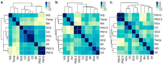 The overall correlation among the meteorological parameters and the air pollutants is illustrated in Figure 7. It revealed that PM10 and PM2.5 had a negative correlation with air temperature, RH, rainfall and WS during most of the seasons across the stations. The seasonal pattern of the correlation among them is illustrated in Supplementary Materials Figure S2. It was observed that the concentration of particulate matter was found highest in the winter season. In winter, the atmospheric inversion is one of the most important reasons for the highest concentration of the pollutants. By the process of accumulation and condensation, the atmospheric inversion can maximize the concentration of PM [45]. The study areas that is, Dhaka, Gazipur and Narayanganj, generally, exhibit the industrial-prone cities in the country. Brick-kilns industries around the corner of the cities are fully operational in winter. Studies revealed that this industry is mostly responsible for the highest concentration of PM around the cities during winter. The north-western wind of the winter season is dominant in the study region, which can transport the PMs from the brick-kilns. On the other hand, in monsoon, the heavy rainfall throughout the cities is the key factor for the low concentration of pollutants. According to the study [44], particulate matter absorbs water vapors in the atmosphere and deposits to the ground since it is made of soil and dust. Moreover, vegetation, that is, leaves can act as an instrumental factor in changing the pattern of particulate matter concentration. In monsoon, the presence of green leaves is abundant, which can minimize the particles from the atmosphere [23]. However, a positive correlation was observed among particulate matter, mean temperature and wind speed in this season. It is mainly because of the high summer temperature and maximum wind speed in that season which can combinedly accelerate the concentration of the pollutant [23,45].
