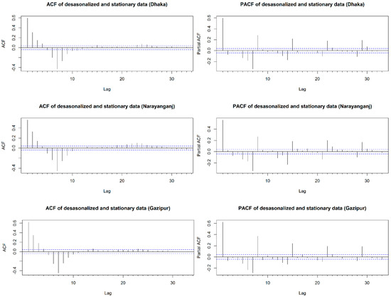 To determine the order of the model, the graph of sample auto correlation function (ACF) and partial autocorrelation function (PACF) should be observed. The ACF and PACF graphs of PM2.5 time series values at Dhaka, Narayanganj and Gazipur, as shown in Supplementary Materials Figure S4, infer seasonality of data which required to be de-seasonalized. For de-seasonalization, first difference in log of PM2.5 time series data with a seasonal first difference at lag 10 was found satisfactory for Dhaka, Narayanganj and Gazipur. Figure 8 illustrates ACF and PACF of deseasonalized and stationary PM2.5 data of air monitoring stations. The figure shows vanishing spikes of ACF and PACF over lag implying non-seasonality of the time series data. Therefore, ARIMA(p,0,q) (P,1,Q), ARIMA(p,0,q) (P,0,Q) and ARIMA (p,0,q) (P,0,Q) process is appropriate to model PM2.5 data of Dhaka, Narayanganj and Gazipur, respectively. Based on minimum AIC, ARIMA (3,0,2) (2,0,2)10, (3,0,2) (2,0,1)10 and (3,0,2) (1,0,1)10 are identified as the best models for modeling PM2.5 concentration of Dhaka, Narayanganj and Gazipur, respectively.