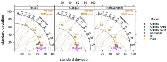 Taylor Diagram of the test results of the models implemented in this study. Among the models, ARIMA-ANN and CatBoost showed the best performance.