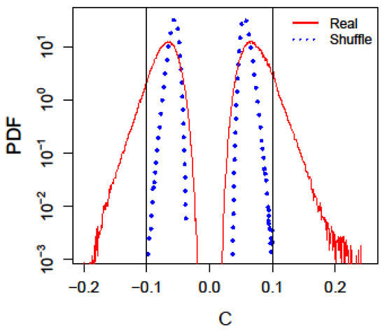 Figure 1. (Color online) Probability distribution functions (PDFs) of correlations C i j for real data and shuffle data. Black vertical lines represent the location of the threshold Δ   =   0.1 . The y-axis is in logarithmic scale.