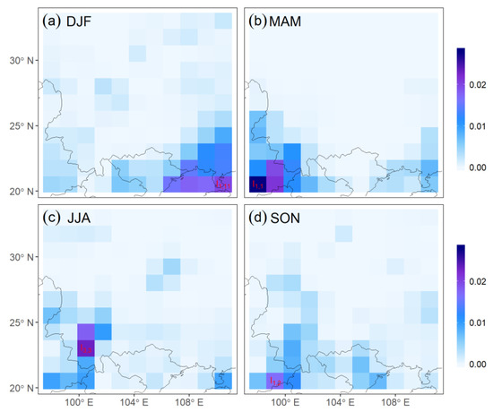 The PA in different locations within SWC could be influenced by different weather systems as suggested by Ma et al. [4] and Shi et al. [7]. To test the correlations between the SSTA and PA nodes, we calculate the weighted in-degree for the PA nodes by Equation (6). We find that some nodes within SWC have small in-degree values and several nodes have strong correlations with the SSTA as shown in Figure 4 and Figure 5. The spatial distribution of in-degree is inhomogeneous and varies with seasons. The important nodes with large in-degree values are almost located in the left- and right- bottom corners of SWC which are close to the Indian, and west Pacific Ocean, respectively. Therefore, these nodes of SWC are easier to be influenced by the Indian and the East Asian monsoons than other nodes in SWC. Note that the largest positive and negative weighted in-degree nodes are the same for MAM (see Figure 4b and Figure 5b). It implies that the most sensitive region in SWC respect to the SSTA can keep both two kinds of correlations.