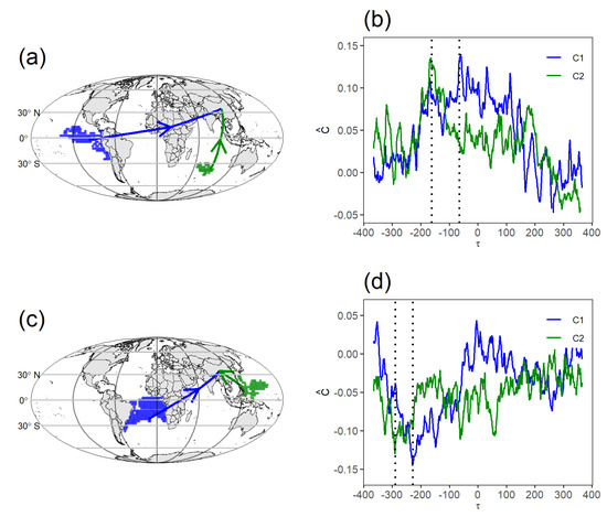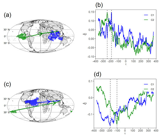 Figure 6. (Color online) Locations of the largest cluster C 1 (blue) and the second largest cluster C 2 (green) for (a) positively correlated with the node I 1 , 1 and (c) negatively correlated with the node I 1 , 11 in SWC for DJF. The blue and green arrows represent the strongest links from C 1 and C 2 to that node in SWC. (b,d) The correlation C ^ as a function of the time lag τ corresponding to the strongest links in map (left), respectively. Dashed black line shows the absolute maximum of the correlation C ^ .