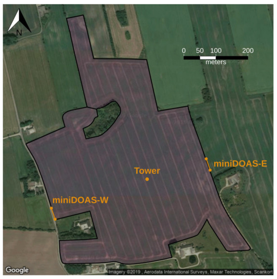 Overview of the field and measurement location on the field. The colored area is the 26-ha field where slurry was applied. MD-W and MD-E are the differential optical absorption spectroscopy (miniDOAS) located west and east, respectively, the tower includes the micrometeorological measurements and point concentration measurement of ammonia (NH3) with cavity ring-down spectroscopy (CRDS).