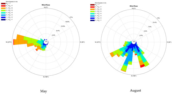 Wind direction and speed for the measurement campaigns in May (left) and August (right).