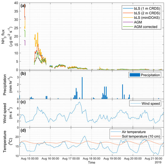 (a) Source emission of NH3 from the measurement campaign in August presented for bLS (1-m CRDS), bLS (2-m CRDS), bLS (miniDOAS), the AGM, and the AGM with footprint correction. (b) Precipitation per hour, (c) wind speed at 10 m, and (d) air temperature and soil temperature at 10 cm. Data in (b–d) are recorded 5 km NE of the field.