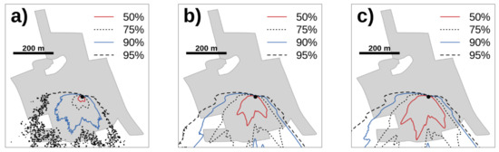 The lines represent the areas contributing to 50%, 75%, 90%, and 95% for (a) the flux footprint area, contributing to the flux measurement. The concentration footprint areas for (b) 1 m and (c) 2 m, contributing to the concentration measurements. Areas for the concentration footprints are approximated by assuming 100% of the contribution is within 750 m. The footprints are averaged over all measurement intervals in August.